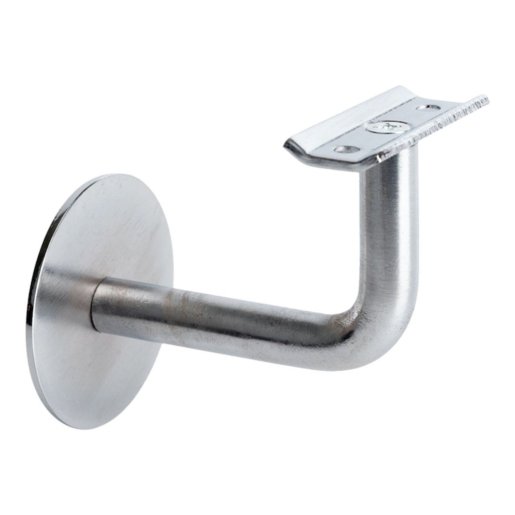 HANDRAIL BRACKET CURVED BRUSHED SATIN CHROME with a satin chrome finish. wall mounted bracket to support a handrail.