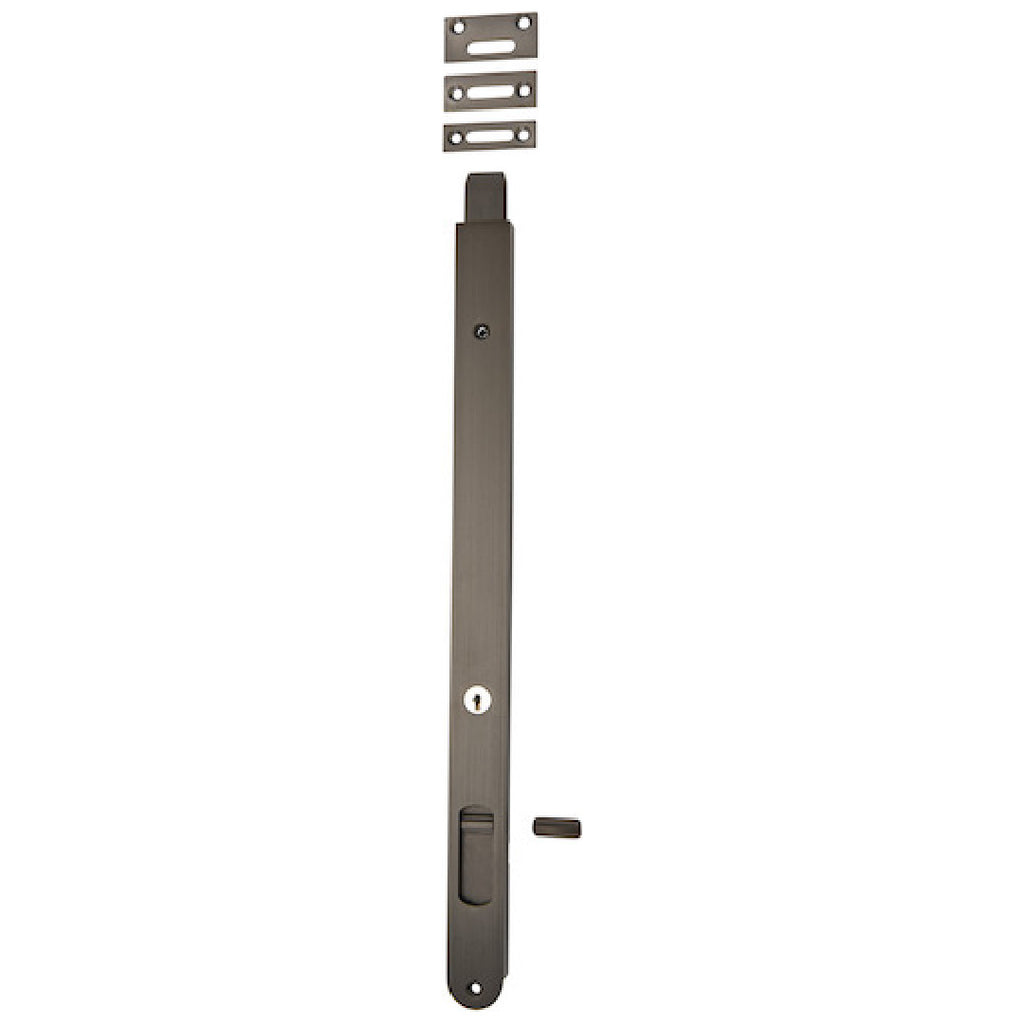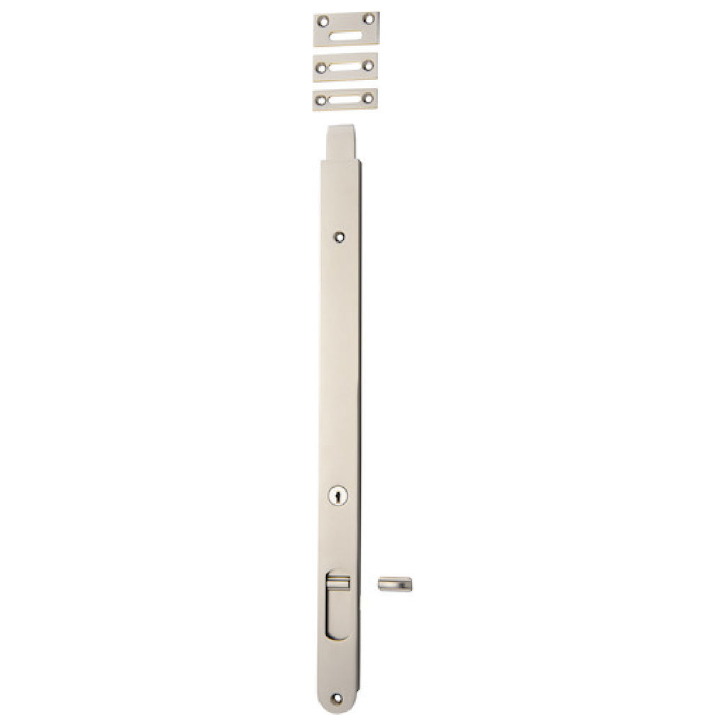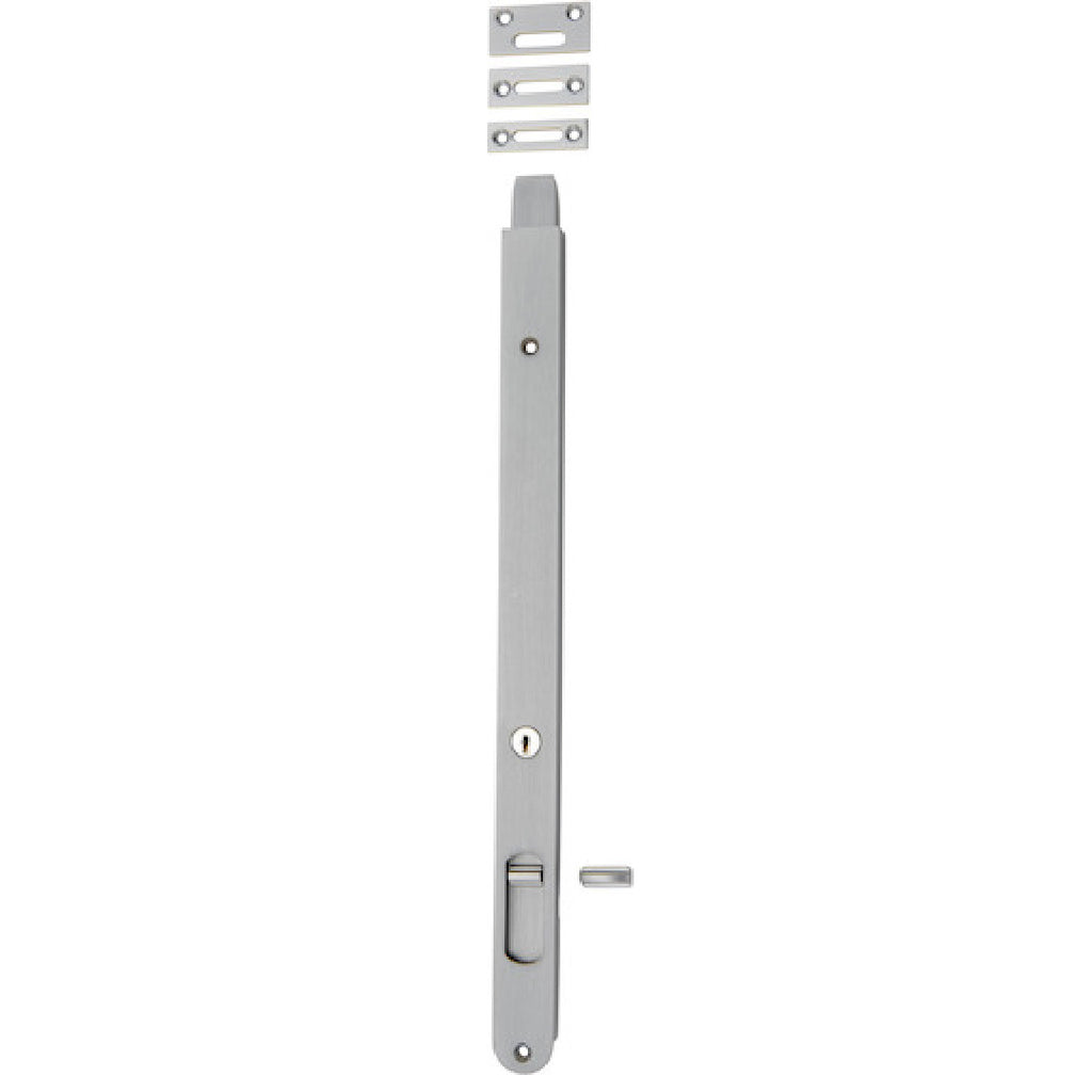IVER FLUSH BOLT LOCKING 400 X 29MM | FINISH: BRUSHED CHROME. Finish: BRUSHED CHROME. Key-operated solid brass locking flush bolt that sits flush within the door.
