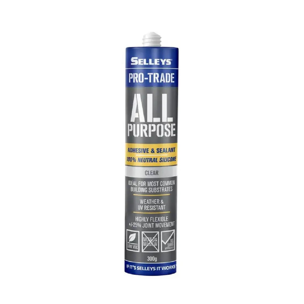 SELLEYS PRO TRADE ALL PURPOSE SILICONE CLEAR 300G white flexible interior gap filler that enables painting in about 10 minutes