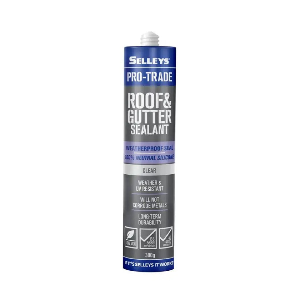 SELLEYS PRO TRADE ROOF & GUTTER SILICONE CLEAR 300G clear neutral cure silicone for roof and gutter applications uv and weather resistant