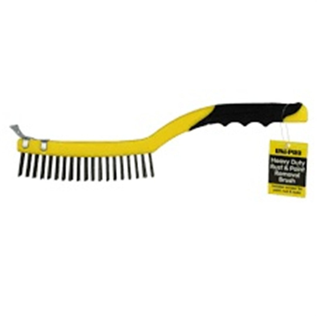 Large rust and paint wire brush with scraper tip and soft grip handle.